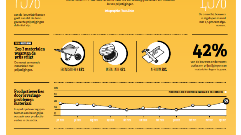 Ondanks de coronacrisis had 64 procent van de bouwers in 2020 een gelijke of zelfs hogere omzet dan in 2019. Wel heeft de sector meer last van leveringsproblemen van materiaal én van prijsstijgingen.