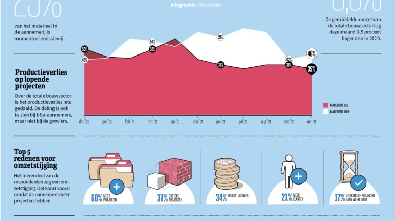 In de Bouwmonitor vragen we maandelijks wat de redenen zijn als respondenten aangeven dat ze productieverlies op projecten hebben. COVID-19 was tot april dit jaar de belangrijkste oorzaak, maar sindsdien zijn de leveringsproblemen van materialen én het tekort aan arbeidskrachten de belangrijkste redenen voor productieverlies.