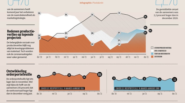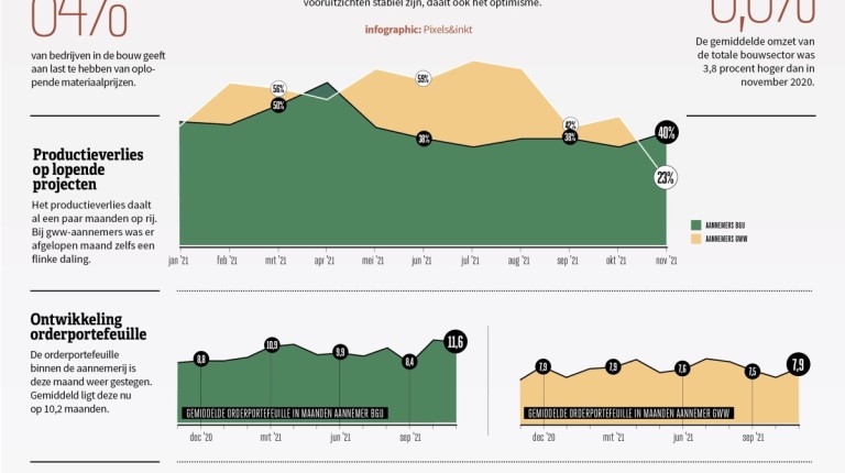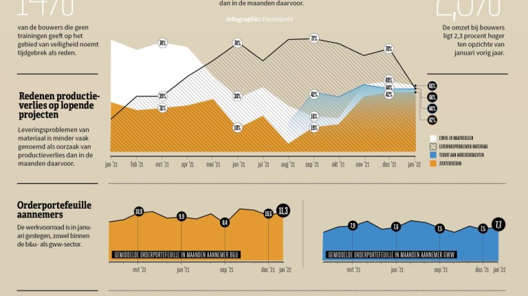 Met een redelijk stabiele orderportefeuille kunnen bouwers gerust 2022 in, maar er zijn wel zorgen over bouwkostenstijgingen en lange doorlooptijden bij gemeenten.